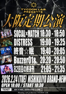タイラボ定期公演! ●日程: 2026/02/24(火) 西九条BRAND-NEW TYCOON LAB. presents.大阪定期公演 【CAST】 ・Buzzer01&. ・82回目の終身刑 他 OPEN 17:30 / START 18:00(予定) ADV ¥1900 / DOOR¥2400 (D別¥700)